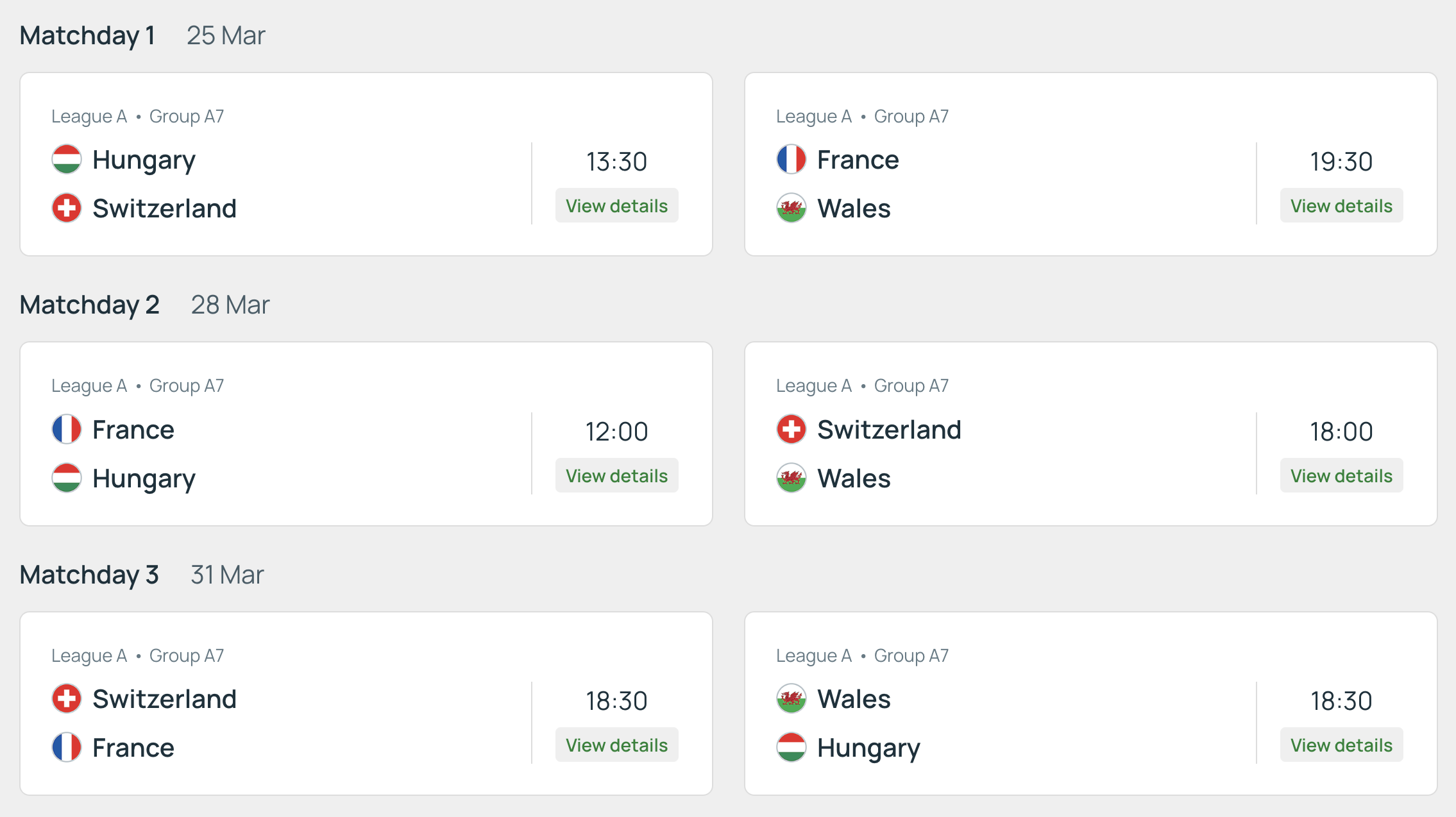 Tous les matchs ont lieu à la Fontenette (entrée gratuite), sauf Pays de Galles – Hongrie qui aura lieu à Vevey.