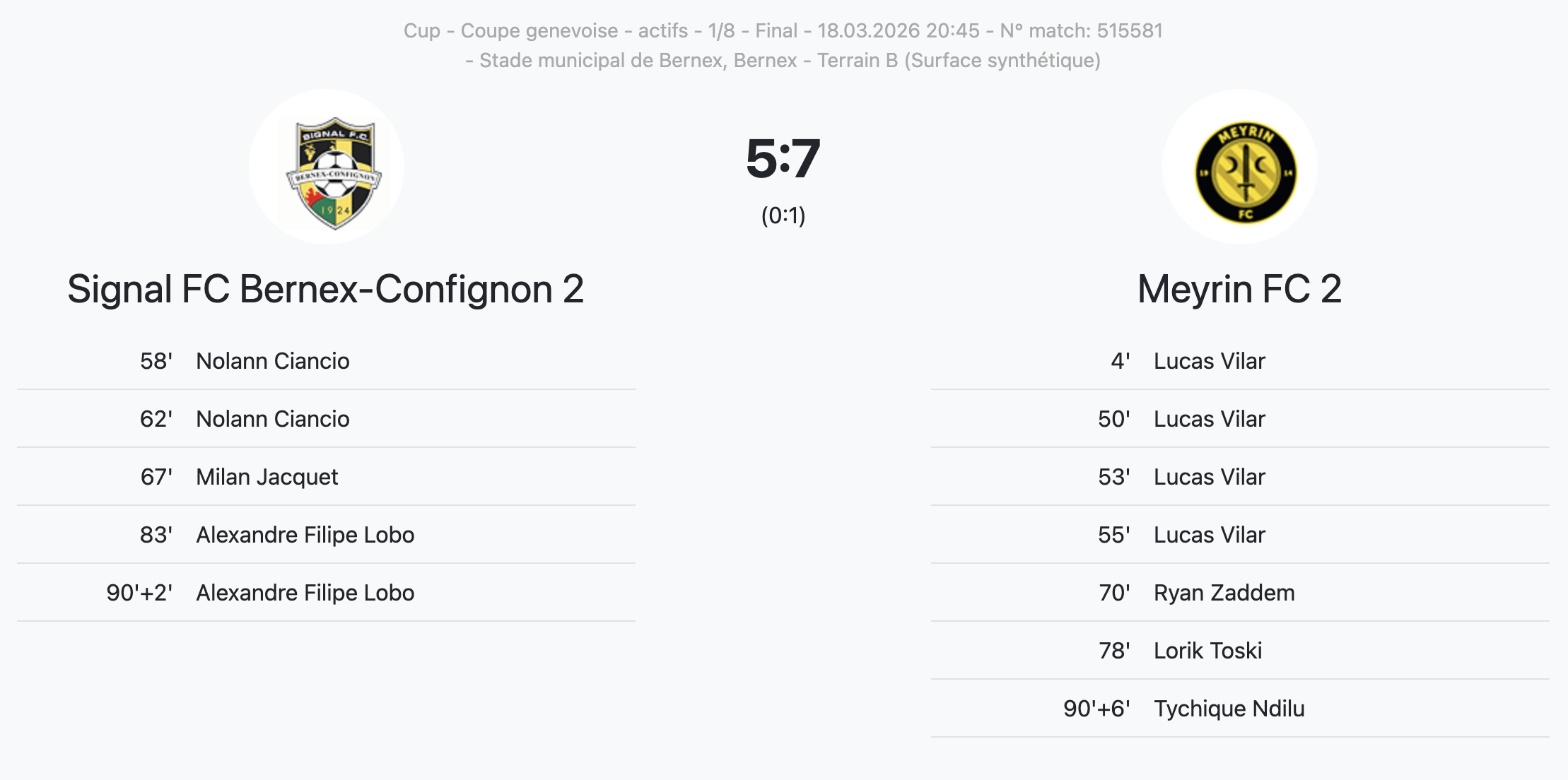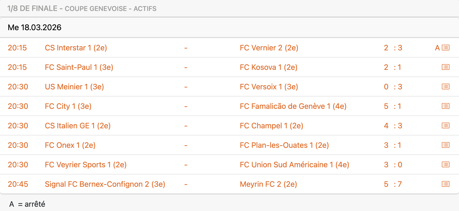 La huitième et dernière rencontre prévue mercredi 18 mars n’a pas pu aller à son terme. À Varembé, le 1/8 de finale 100% 2e ligue entre le CS Interstar et le FC Vernier II a été arrêté à la 119e minute. Alors que le CSI menait 2-1 et semblait se diriger vers une qualification en 1/4, Alyosha Nettleton a égalisé dans les arrêts de jeu et a envoyé le match en prolongations. Le but de Beni Asolua (115′) a ensuite permis à Vernier II de prendre les devants pour la première fois de la partie, avant que l’arbitre ne renvoie tout le monde aux vestiaires prématurément. Plus d’informations quant à l’arrêt de cette rencontre suivront.