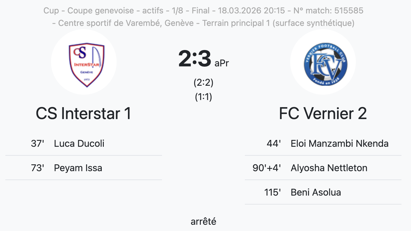 Les 1/8 de finale de la Coupe genevoise des actifs ont été marqués par l’exploit de Saint-Paul contre Kosova (2-1), mais aussi par le match arrêté à la 119e entre Interstar et Vernier II (2-3).