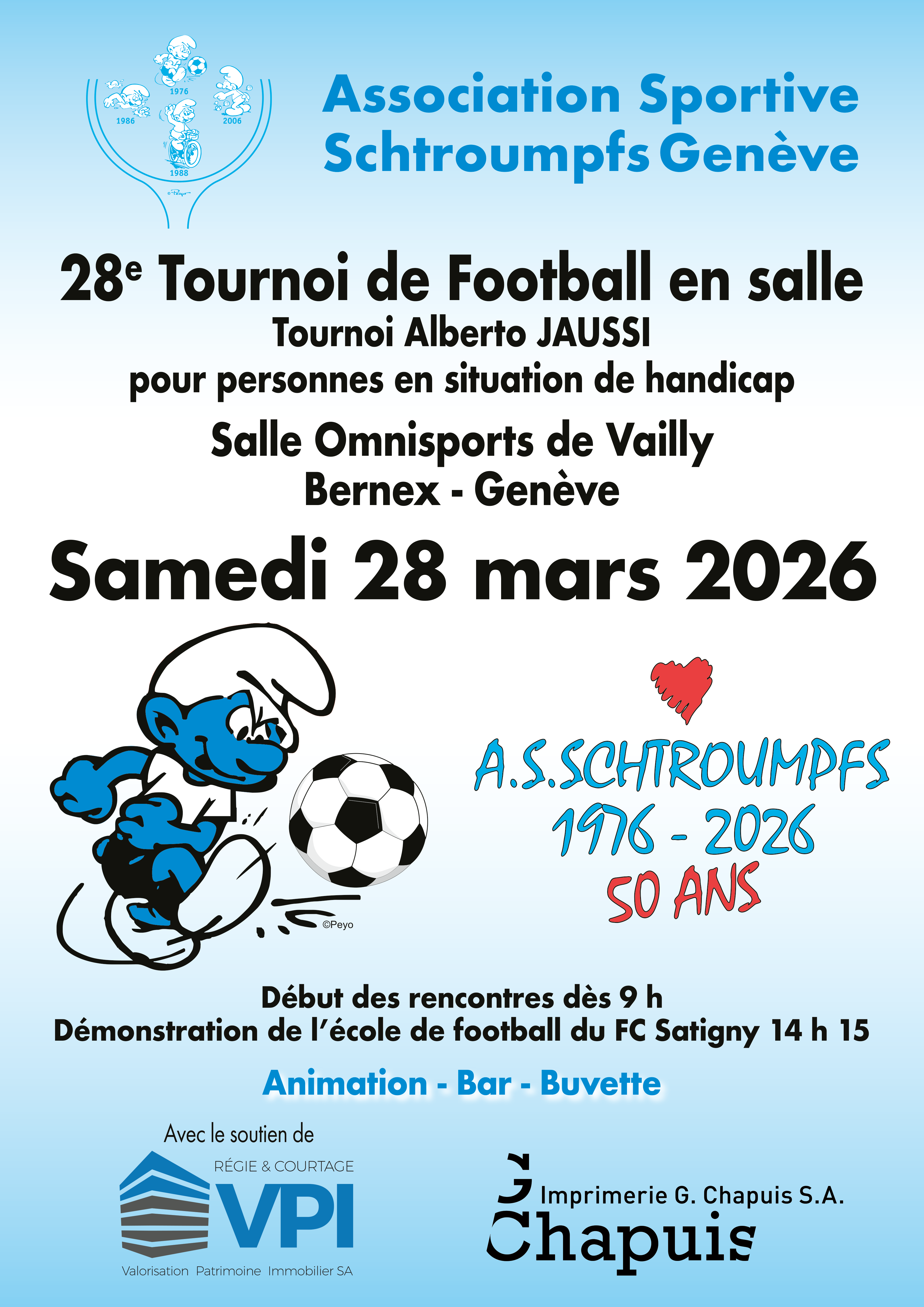 L’année 2026 de l’Association Sportive Schtroumpfs Genève s’apprête à entrer dans le vif du sujet. Le premier grand rendez-vous sportif du printemps arrive en effet à grands pas. La 28e édition du tournoi de Football en salle “Alberto Jaussi” (initiateur du tournoi) aura lieu ce samedi 28 mars 2026 à la salle omnisports de Vailly (Bernex). Un rendez-vous rassembleur, convivial et entraînant qui s’annonce une fois de plus immanquable.