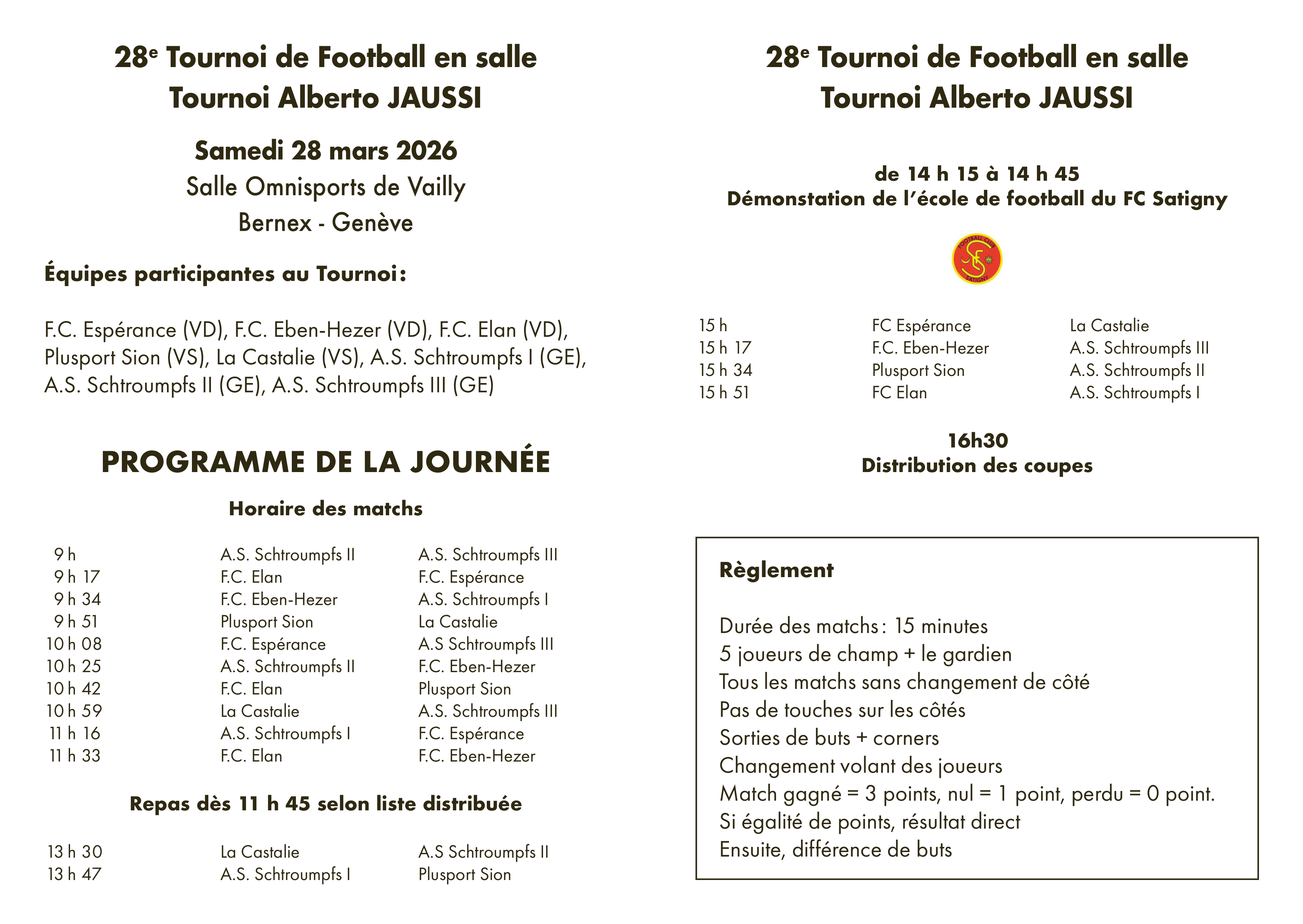 Huit équipes des cantons de Genève, Vaud et Valais prendront part au tournoi Alberto Jaussi. Celui-ci se tiendra le samedi 28 mars, dès 9h du matin, à la salle omnisports de Vailly (Rte de Chancy 1233, 1233 Bernex) . La distribution des Coupes, qui clôturera une journée intense, est prévue pour 16h30. Avant cela, de 14h15 à 14h45, l’école de football du FC Satigny sera présente sur place pour une démonstration qui promet de susciter un certain engouement.