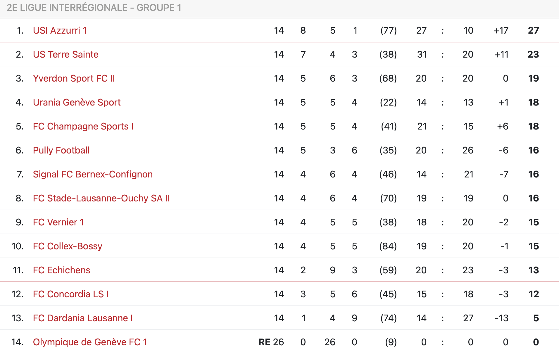 La situation au classement, dans le groupe 1 de 2e ligue inter.