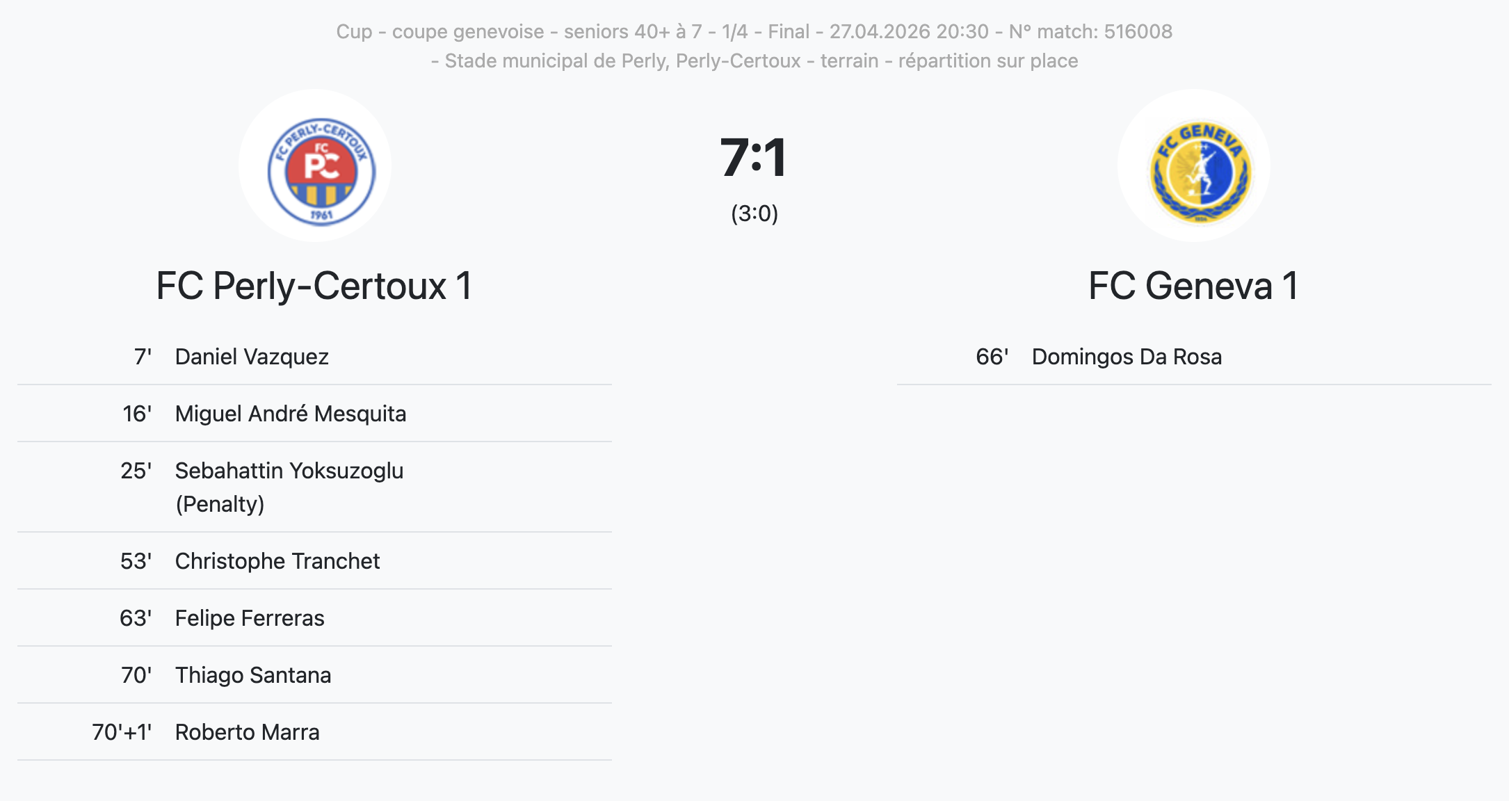 Le tenant du titre Perly s’est imposé 7-1 contre le FC Geneva, qui avait accédé aux quarts de finale en profitant de l’élimination sur tapis vert d’APG en 1/8.