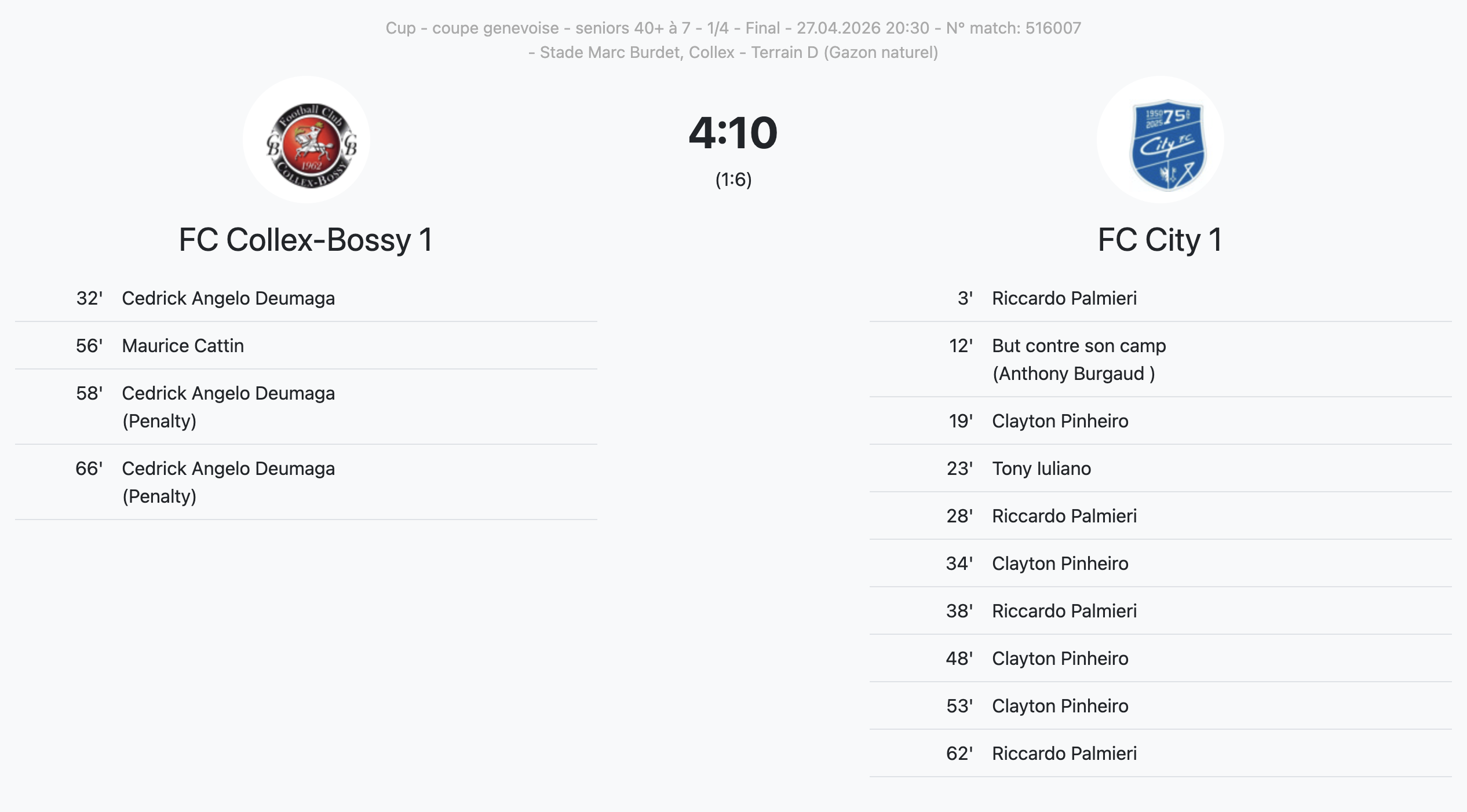 Le FC City a quant à lui créé la sensation. L’équipe entraînée par Mihai Constantin Papuc, qui évolue dans le groupe “Promotion”, a gagné 10-4 (!) à Collex, qui évolue lui dans le groupe “Champion”. Riccardo Palmieri et Clayton Pinheiro ont marqué un quadruplé chacun.
