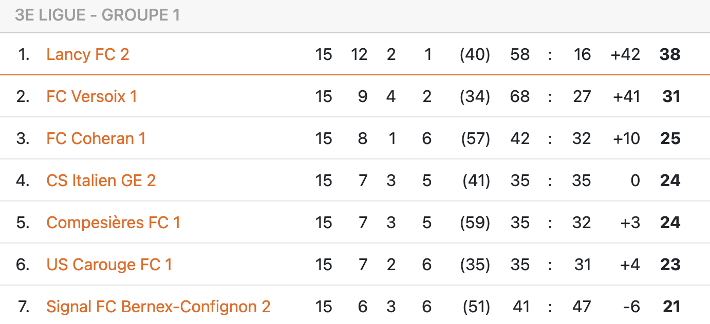 3e ligue, groupe 1Le troisième accueille le deuxième, dans le groupe 1 de 3e ligue. Grâce à ses deux récentes victoires contre Champel II (6-0) et Geneva (3-1), l’équipe des Tattes est remontée à la 3e place, à six unités des hommes de Steve Laureti, mais avec un goal-average (+10) nettement inférieur à celui des Versoisiens (+41). Même en cas de succès contre les Bleu et Blanc, aller chercher la 2e place de Versoix (qui accuse un retard de 7 unités sur le leader Lancy II), s’annonce donc bien compliqué. À l’aller, Versoix s’était imposé 3-1 au Municipal.