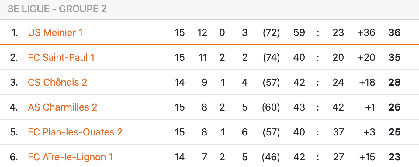 3e ligue, groupe 2Le grand-rendez-vous du week-end se tient dimanche après-midi à Rouelbeau. Le derby entre Meinier et Saint-Paul, les deux premières équipes du groupe 2, s’annonce formidable. Le vainqueur pourrait d’ailleurs prendre une option plus ou moins importante sur la première place et la promotion en 2e ligue, avec encore 6 journées à jouer après ce choc.