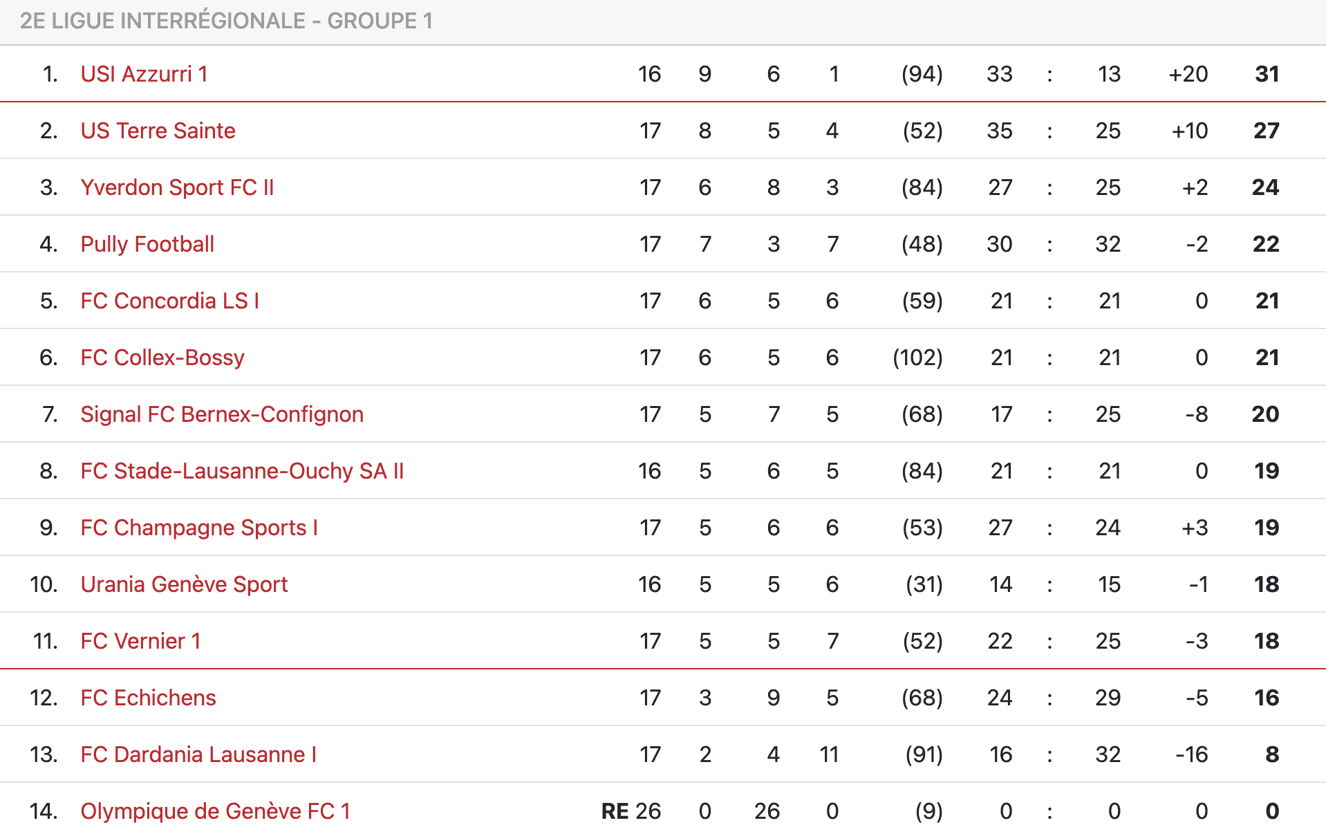 2e ligue interNous l’avons dit et redit : tout est très serré au classement dans le groupe 1 de 2e ligue inter. UGS, quatrième à la trêve (à -9 de la tête et à +6 de la zone rouge), sait de quoi il parle. L’équipe entraînée par Uros Cetkovic, qui a perdu ses deux premières rencontre officielles de 2026 sur la plus petite des marges (0-1 contre Collex, puis le SLO), a glissé à la dixième place. Avant d’accueillir le leader Azzurri, les Ugéistes n’ont donc plus que 2 points d’avance sur Echichens, première équipe relégable avec 16 points.