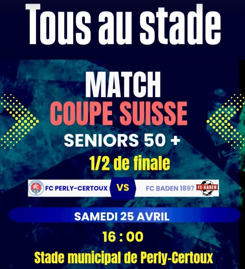 Coupe de Suisse Seniors 50+Les Seniors 50+ du FC Perly-Certoux ont devant eux une fin de saison des plus enthousiasmantes. Après avoir réussi un doublé Coupe–championnat la saison dernière, ils sont en course pour un triplé lors du présent exercice. Samedi, à la maison (16h), c’est de la Coupe de Suisse qu’il s’agira. S’ils parviennent à s’imposer contre le FC Baden, les Perlysiens iront représenter Genève le 20 juin prochain à Lugano, à l’occasion des finales de Coupe de Suisse des Seniors 30, 40 et 50+. À noter qu’un autre représentant genevois, APG, est encore en course chez les 40+. Un long déplacement à Uzwil (samedi, 18h) est au programme pour les pensionnaires du Bout-du-Monde.
