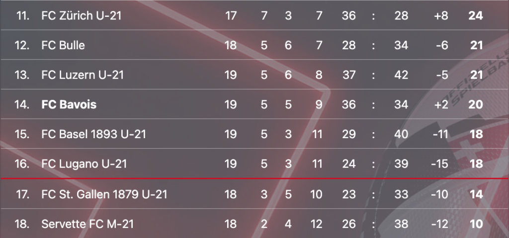 Gagner sur le terrain d’une équipe de la première moitié de tableau aurait été une excellente opération pour le FC Bavois, qui avec ce point supplémentaire ne garde une avance que de six unités sur Saint-Gall M-21, premier relégable. Un écart qui pourrait se réduire davantage si les Brodeurs venaient à faire des points dimanche contre la lanterne rouge Servette M-21.