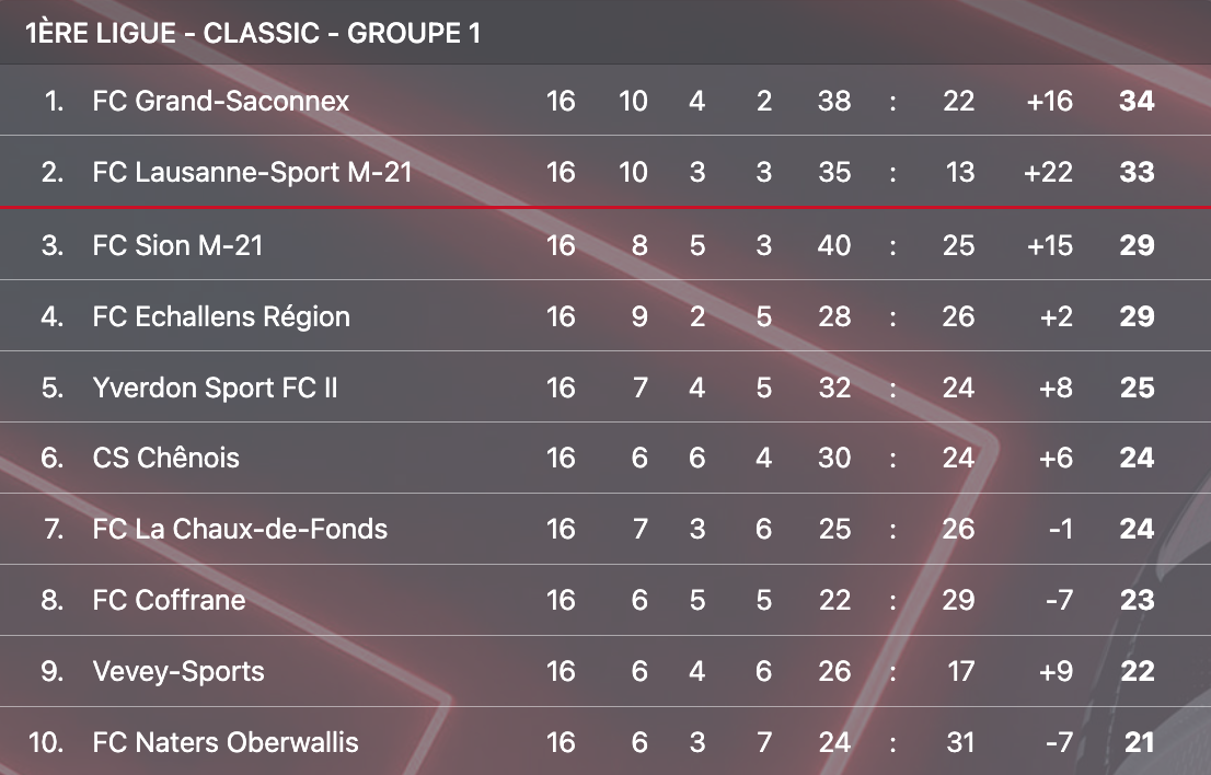Grand-Saconnex (4-2-3-1) : Monteiro – Perracino, Rezzonico ©, Selmani (65′ Passi), Semedo (83′ Antonio) – Costa, Rahimi – Ssebunya (45′ Oliveira), Soares (60′ Papa), So (60′ J. Ducoli) – Salan.