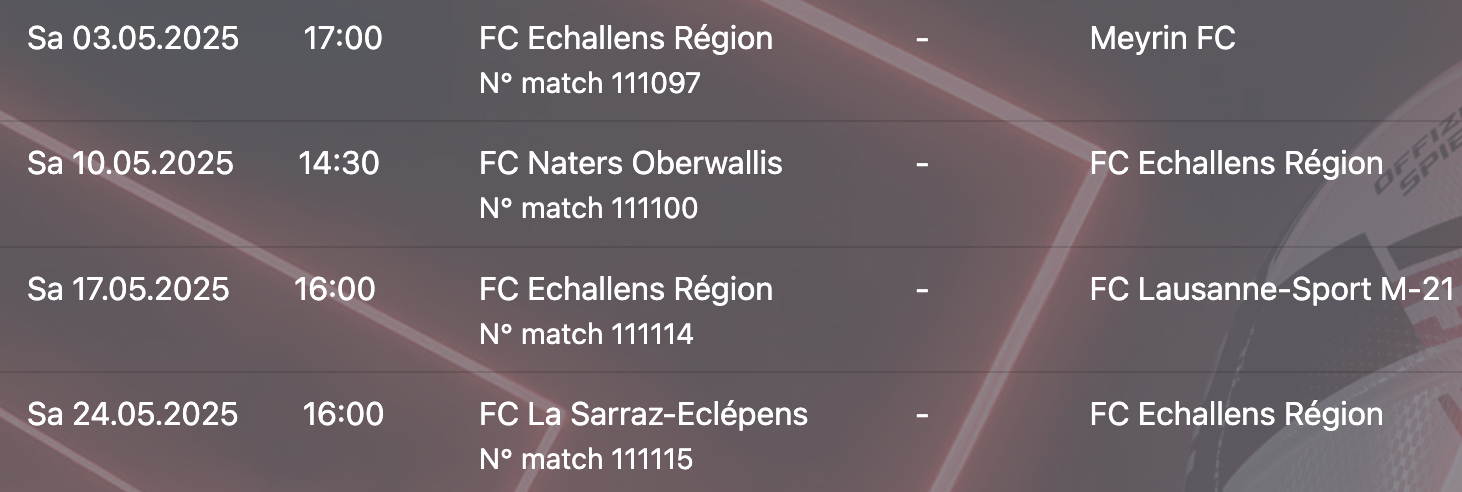 Le calendrier d’Echallens, pour le rush final, avec deux confrontations directes contre Meyrin (J27) et Lausanne M-21 (J29).