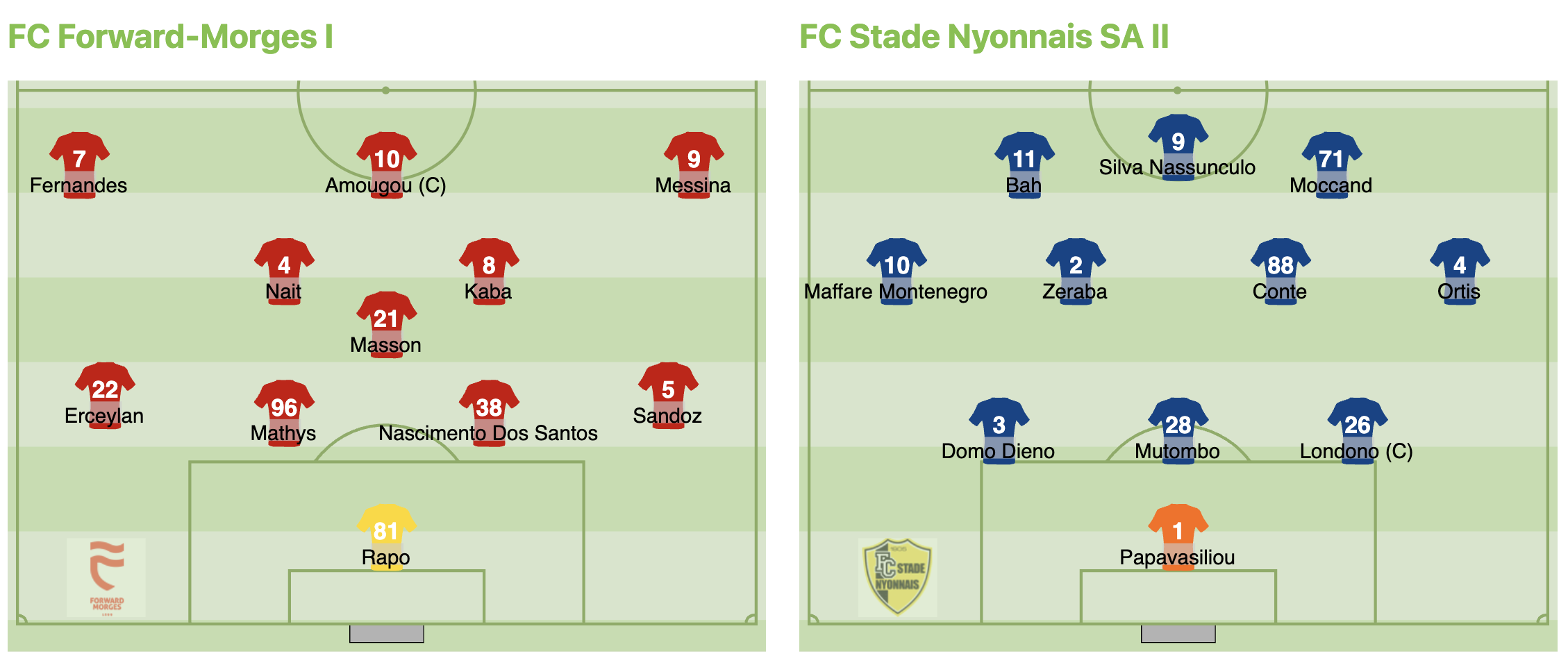 Le parc des Sports est réputé pour être la forteresse du FC Forward-Morges. Poussés par de nombreux supporters, les Morgiens n’ont pas profité de l’élan du 12ème homme pour rentrer fort dans la partie. Rapidement submergés par les offensives nyonnaises, les hommes de Raphaël Cand ont concédé l’ouverture du score par Jurgen Maffare, qui a inscrit son 8ème but sur les cinq derniers matchs toutes compétitions confondues (10’ 1-0).