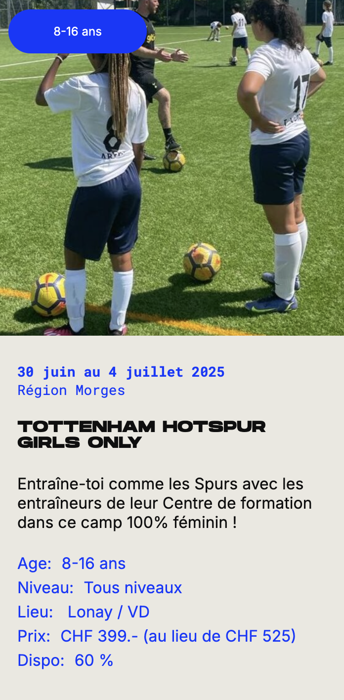 Sur le site de STAR SPORTS, les inscriptions pour le camp “TOTTENHAM HOTSPUR GIRLS ONLY” sont déjà ouvertes. L’occasion de rappeler le partenariat liant la compagnie vaudoise et le club professionnel londonien : “On travaille avec Tottenham depuis 2017”, rappelle David Ashtamkar. “Cela faisait sens d’être avec eux aussi pour ce premier camp 100% féminin, car Tottenham a une section féminine en plein développement en Angleterre. Les entraîneurs qui viennent encadrer les enfants sur nos camps viennent en grande partie du club de Tottenham, où ils travaillent pendant l’année”. Pour compléter l’équipe, des coachs du club local mettant à disposition les infrastructures sont aussi engagés.