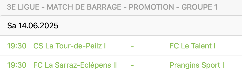 La Tour-de-Peilz sera face à Le Talent, 1er du groupe 4, La Sarraz-Eclépens II, 2ème du même groupe et Prangins, relégable à Noël et auteur d’un deuxième tour sensationnel avec dix victoires et un nul en onze match. “C’est un avantage d’évoluer deux fois à domicile“, a admis le coach de La Tour. “Cependant, rien n’est fait. C’est une motivation supplémentaire d’évoluer face à des équipes qui ont bien terminé la saison“.