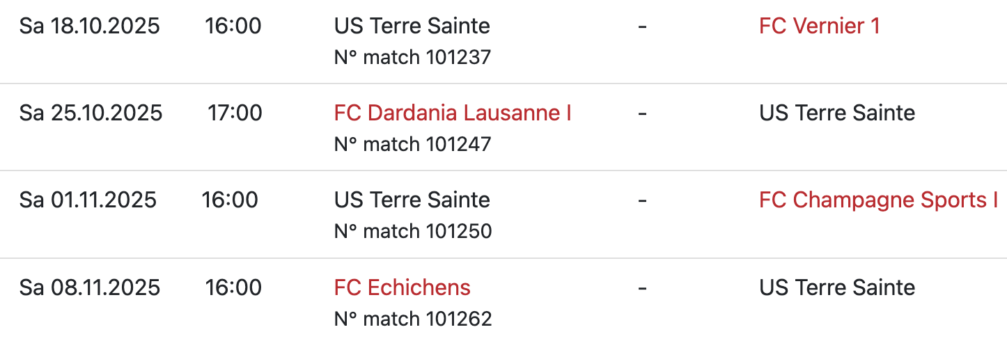 Terre Sainte affrontera encore Vernier, Dardania, Champagne et Echichens…. avant une longue trêve hivernale.