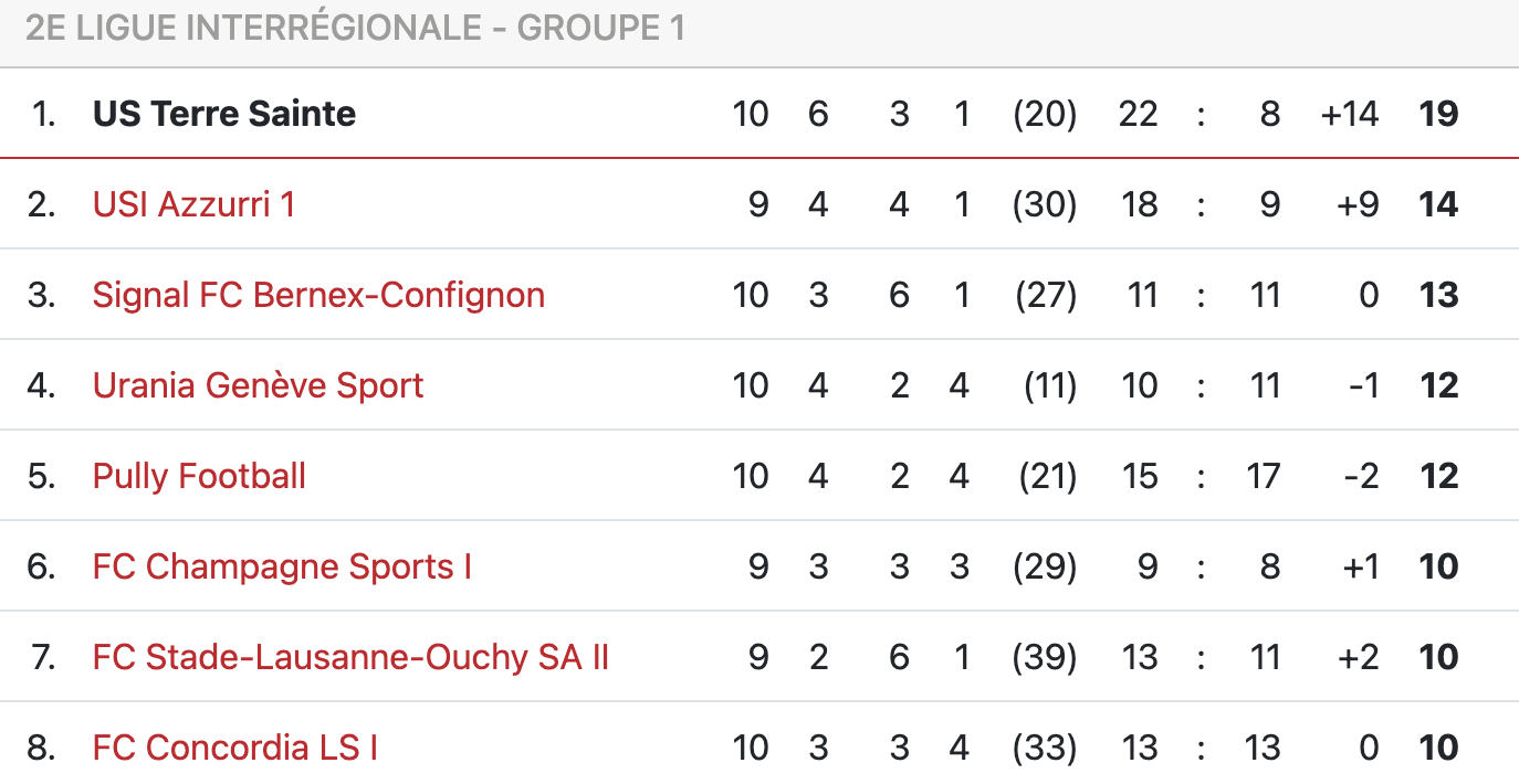 Terre Sainte pourrait voir son premier poursuivant Azzurri revenir à -2 lors du week-end (Concordia – Azzurri samedi 11 à 17h). Il ne restera ensuite plus que quatre matchs, en 2024, pour tenter de consolider cette première place…