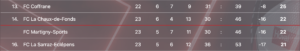 L’équipe de Julien Marendaz a obtenu sa première victoire depuis le 18 mars dernier sur le terrain de Naters, grâce à Aliou Niang auteur d’un doublé (1-2). Malgré cela, les succès de La Chaux-de-Fonds à Lancy (3-4) et de Martigny à Coffrane (3-5) maintiennent les Sarrazins à la dernière place. Dans la course aux finales, le leader Saint-Prex a concédé sa première défaite de l’année 2026 à Echallens (2-1). Malgré une ouverture du score précoce, la troupe d’Andy Laugeois a craqué en deux minutes sur deux penaltys de Théo Rochat (52’/54′). Les Saint-Préyards restent en tête avec trois points d’avance sur Prishtina Bern qui a partagé l’enjeu à Portalban (1-1).