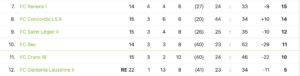 Avec son succès contre Crans IB (3-2), Saint-Légier II n’est plus relégable et a même gagné deux places, suite à la défaite de Bex sur le terrain de Lutry II (3-1). Renens a également pris de l’air grâce à une victoire sur le fil dans les arrêts de jeu contre Pully II (3-2). Les victoires combinées d’Azzurri Lausanne et Malley (3-5 face à Concordia) semblent quant à elles mettre fin à tout suspense dans la course aux finales de promotion.